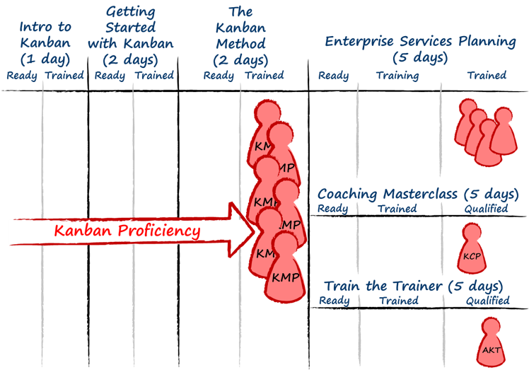 Three parallel tracks are then offered: Enterprise Services Planning; Kanban Coaching Masterclass; Kanban Train-the-trainer. Enterprise Services Planning is designed for managers from line level to senior decision makers who must worry about enterprise scale concerns, customer satisfaction and fitness for purpose. Enterprise Services Planning is designed to delivery practical solutions for pragmatic practitioners.The Kanban Coaching Masterclass is a step towards receiving the Kanban Coaching Professional (KCP) credential. KCPs must complete the masterclass, demonstrate at least 6 months Kanban coaching experience through a case study essay and a panel interview. The KCP track is designed for people who wish to lead or coach Kanban and Enterprise Services Planning initiatives with their employer or clients.